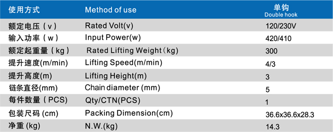 采用吊钩悬挂式或吊环悬挂式安装采用机械制动和上下行程开关控制;采用高强度起重环链使用寿命更长采用110V、230V单相电源。